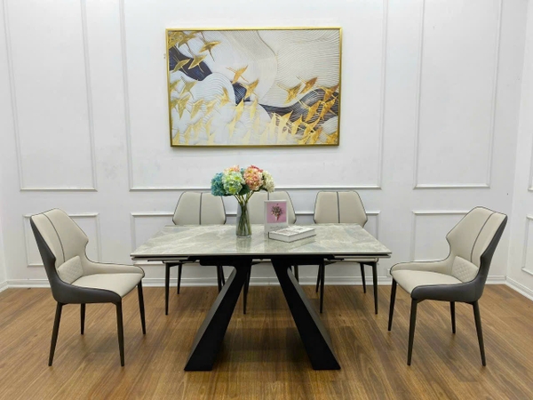 - Mẫu 1: Bàn ăn mặt đá marble chân X cong trắng vân xám, chân bàn gỗ sồi, kiểu dáng chữ nhật, kích thước 1m8x1m.