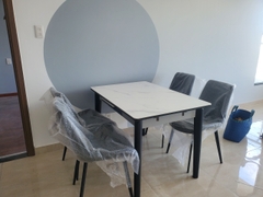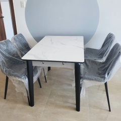 Bàn ăn có thể kết hợp với 4 ghế ăn nhập khẩu, ghế ăn chân sắt sơn đen bọc nệm.