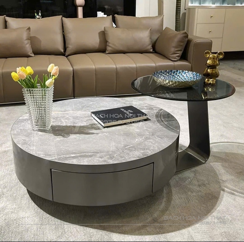 Ban tra hinh tron mat da ket hop vơi ban tra nho mat king sang trong