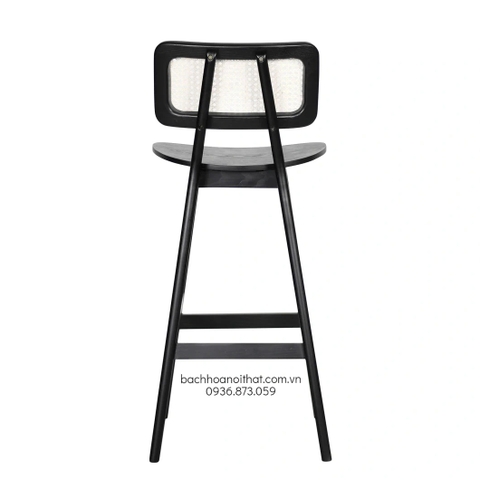 Ghế bar cafe có tựa lưng đan mây nhựa kết hợp với mặt ngồi bằng gỗ Ash đã được xử lý, bốn chân gỗ chắc chắn kèm 4 thanh giằng ngang giúp người ngồi cảm thấy an toàn và thoải mái.
