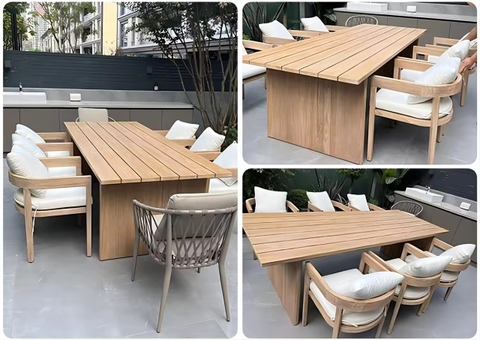 Hình 26. Bàn gỗ Teak khổ ván 10*20cm kết hợp ghế gỗ teak có nệm dùng ngoài trời