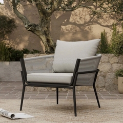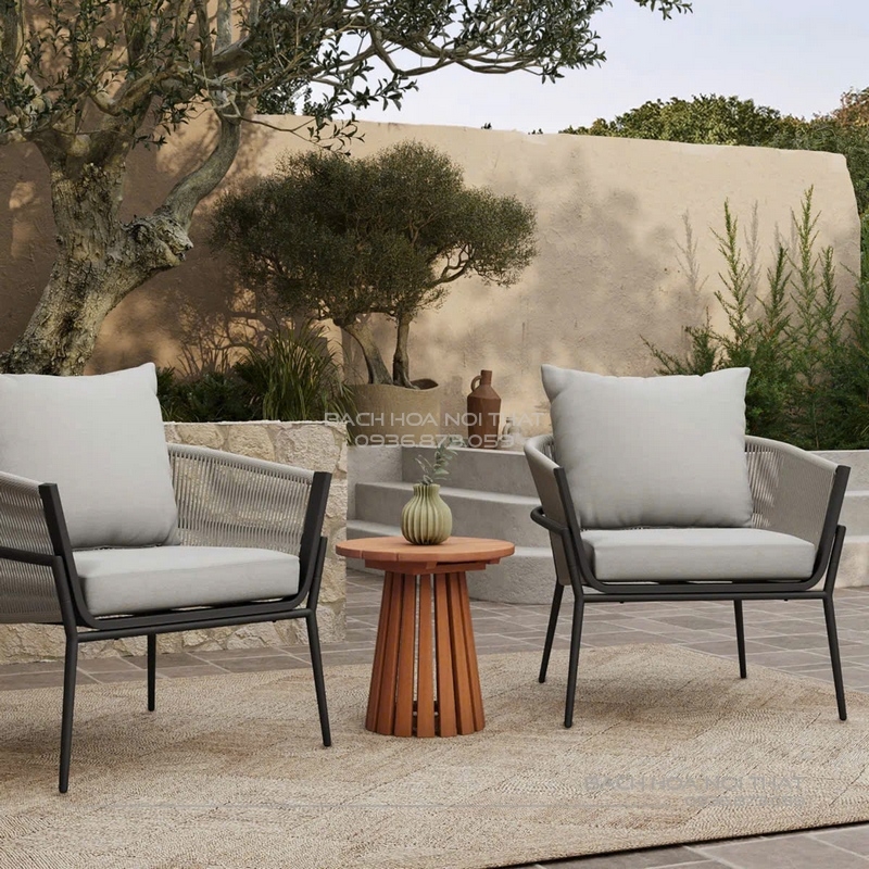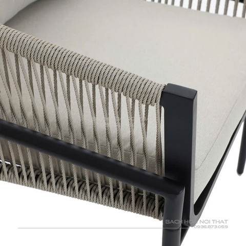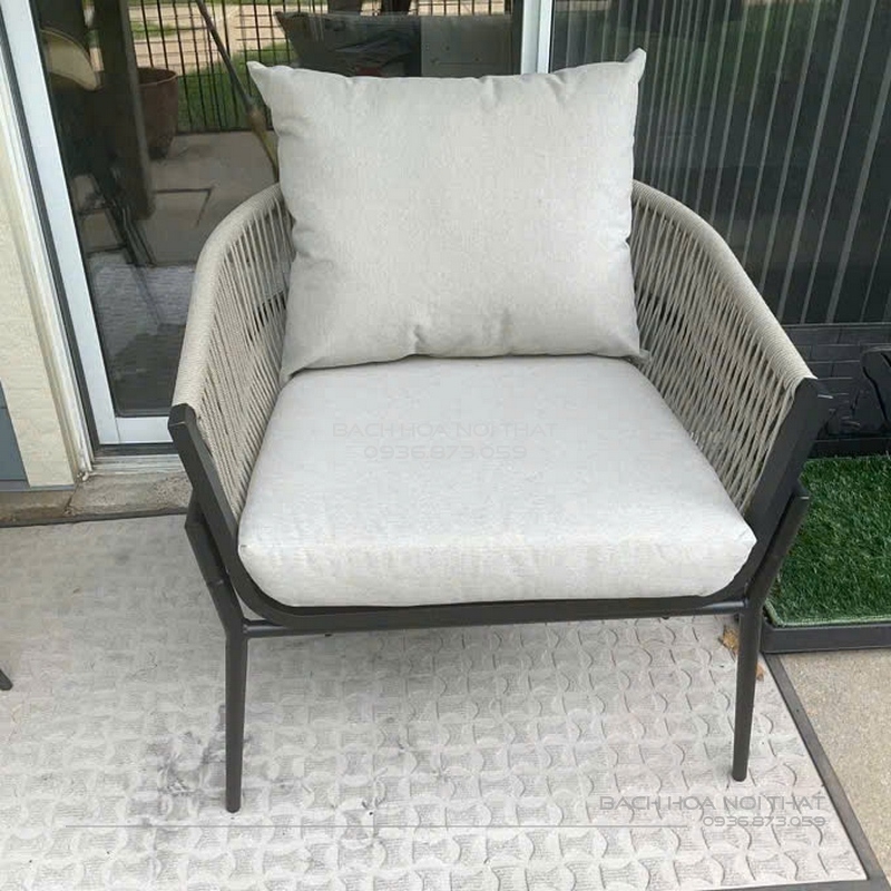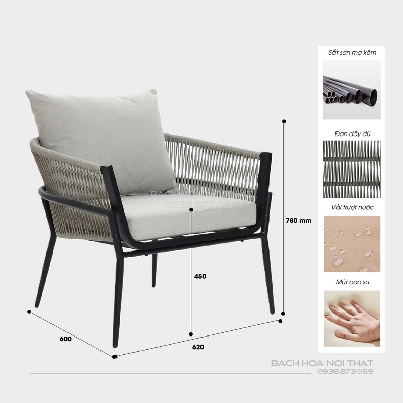 4. Chất liệu: Khung sắt sơn tĩnh điện đen, nệm cao su bọc vải trượt nước, đan dây.