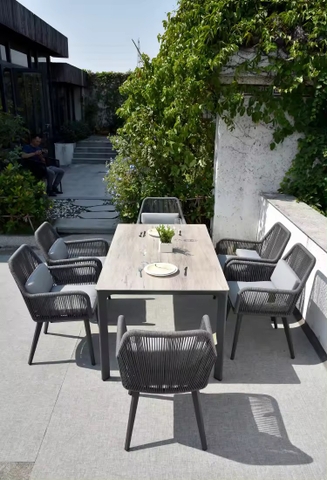 - Đan dây nhựa: Ghế được đan bằng dây nhựa cao cấp, chống nắng, chống nước, bền đẹp theo thời gian. Phần đan dây nhựa tạo cảm giác thoáng khí, thoải mái, phù hợp với môi trường ngoài trời.