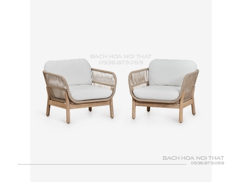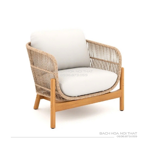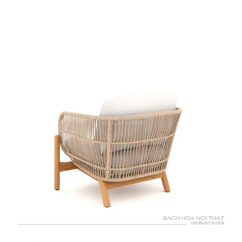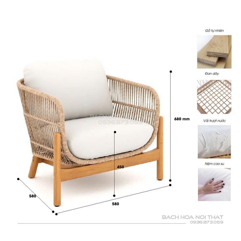 4. Chất liệu: Khung gỗ tech, nệm cao su bọc vải trượt nước, đan dây.