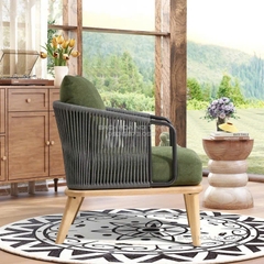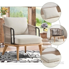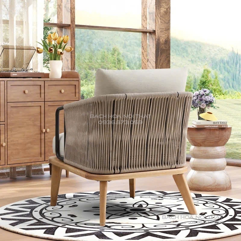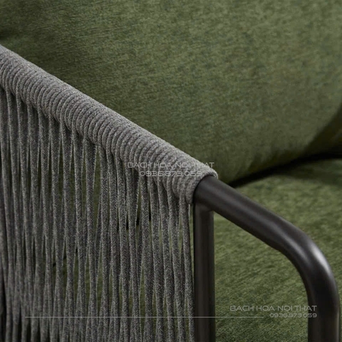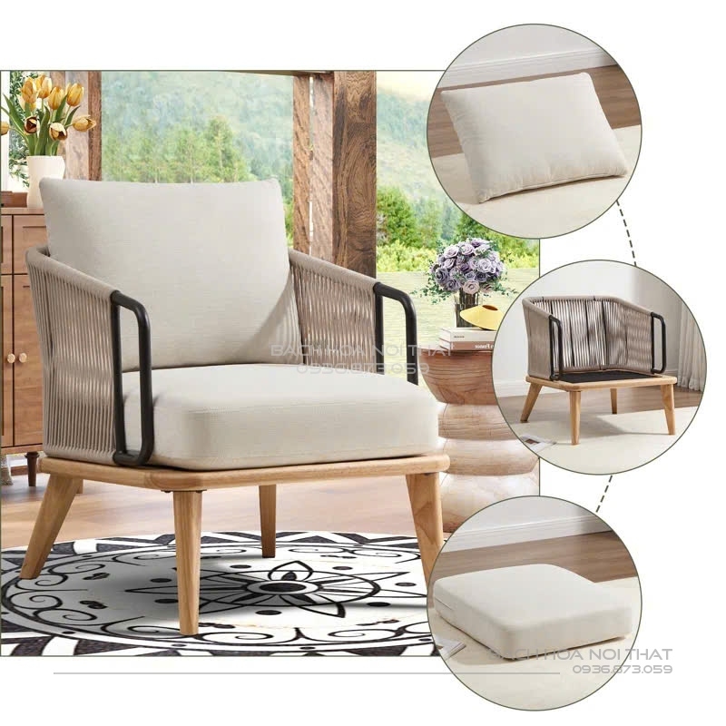 4. Chất liệu: Khung sắt sơn tĩnh điện đen, khung gỗ tech, nệm cao su bọc vải trượt nước, đan dây.
