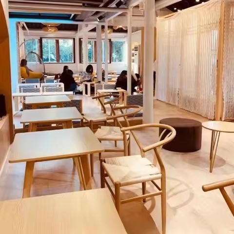 Ghế wishbone đan dây màu tự nhiên sử dụng cho quán cafe