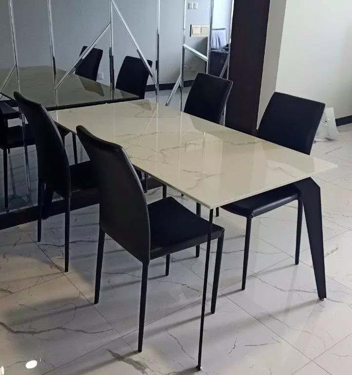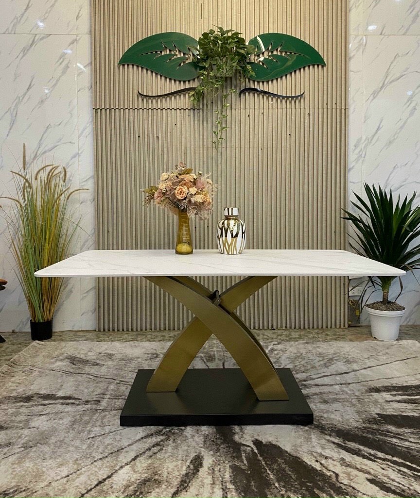 Bàn ăn Chân sắt sơn tĩnh điện kết hợp Mặt đá tự nhiên dày 20mm màu trắng vân mây