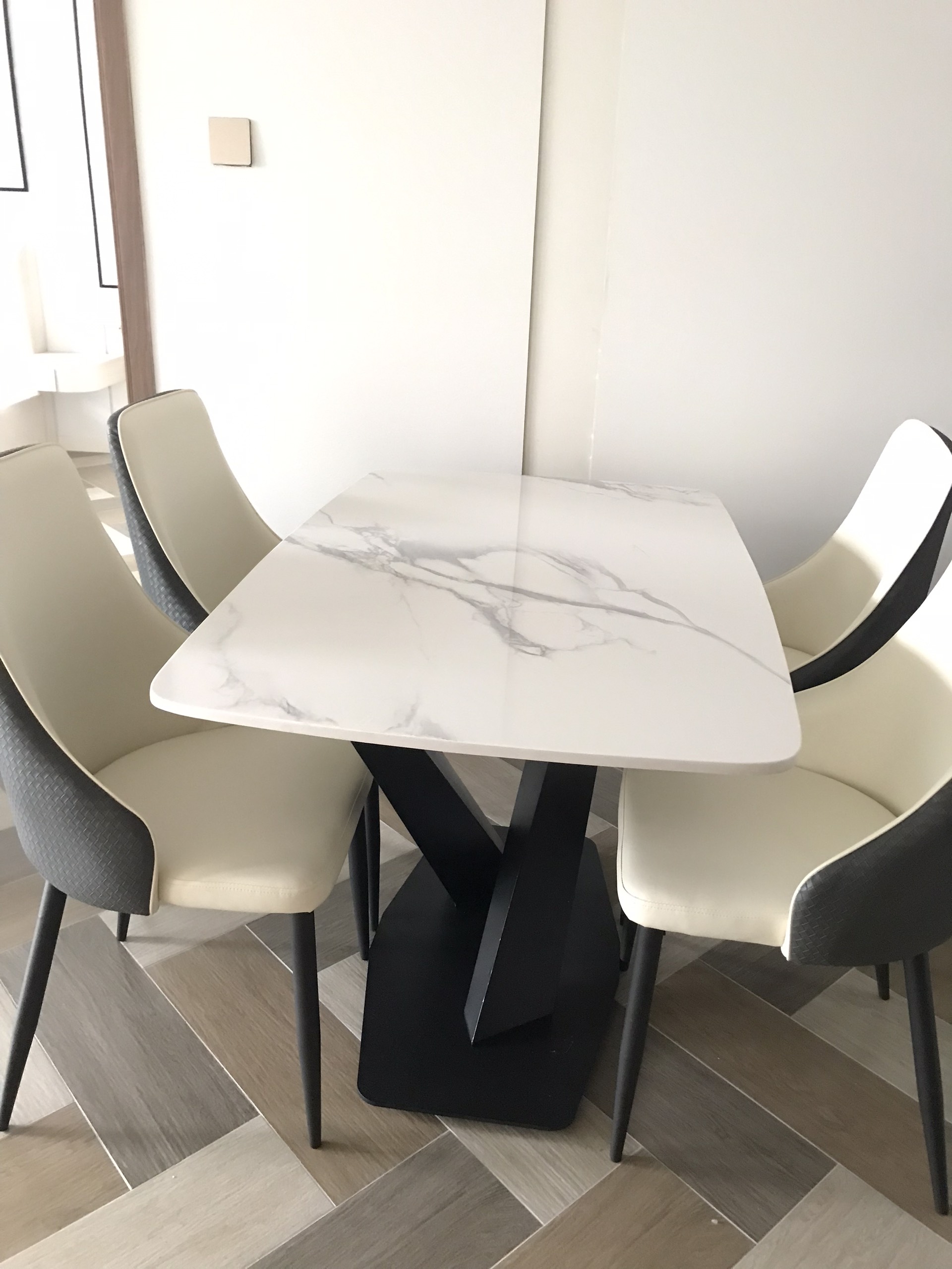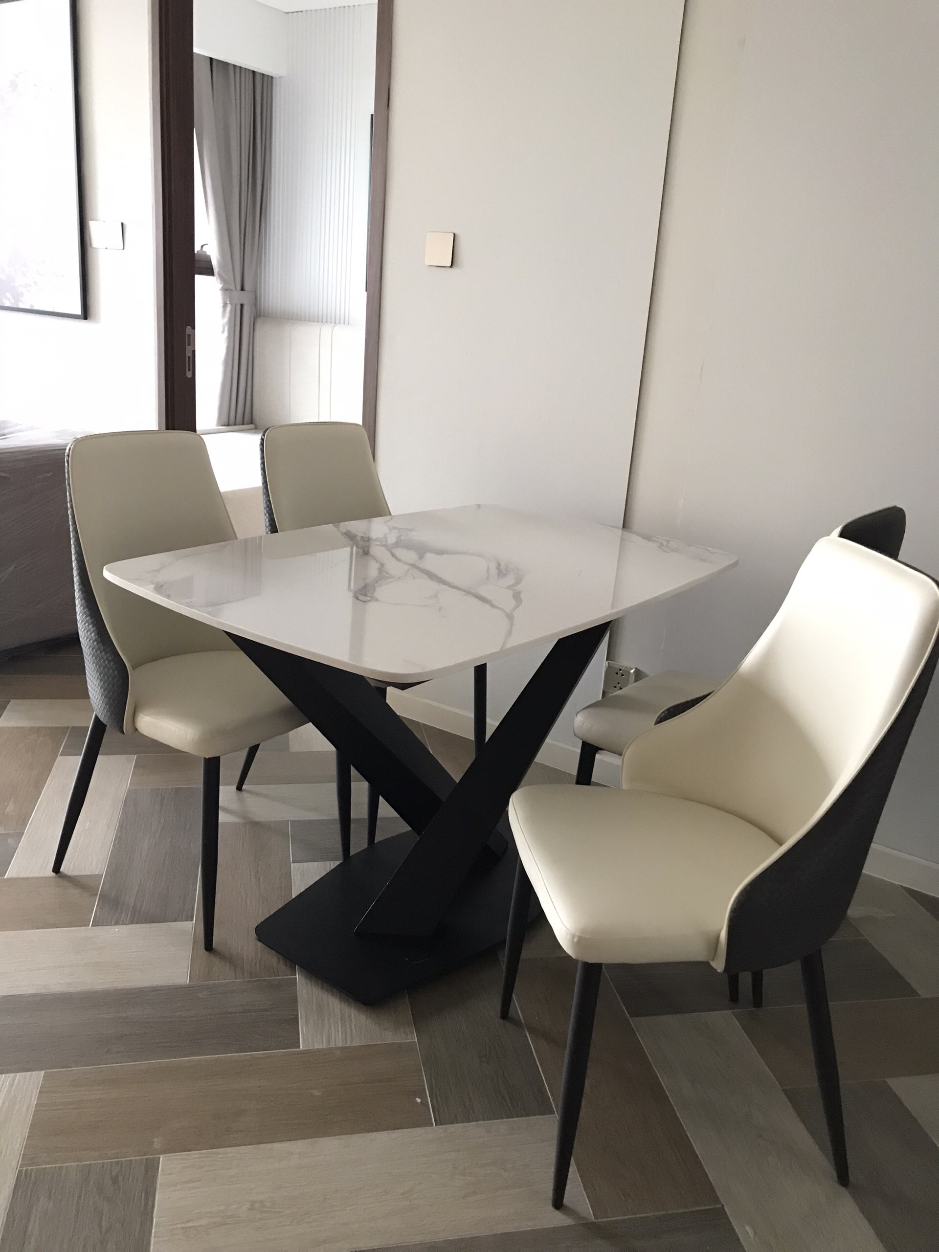 Chân bàn ăn chữ X có tính thẩm mỹ cao khi kết hợp với mặt bàn trắng vân mây. Thiết kế bàn chắc chắn, trẻ trung, hiện đại, phù hợp với không gian thiết kế căn hộ hiện nay.